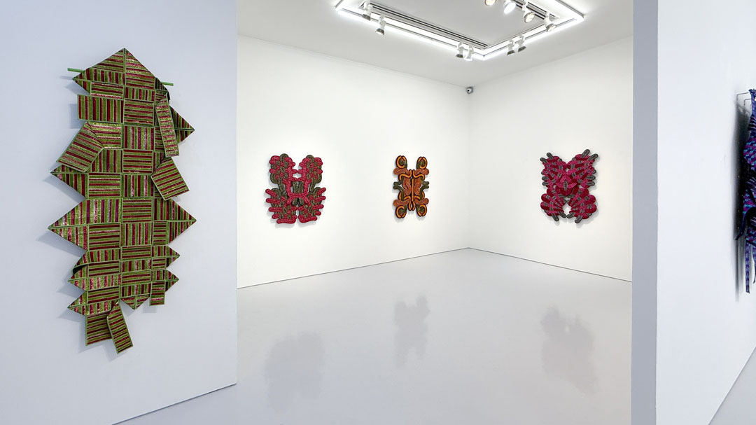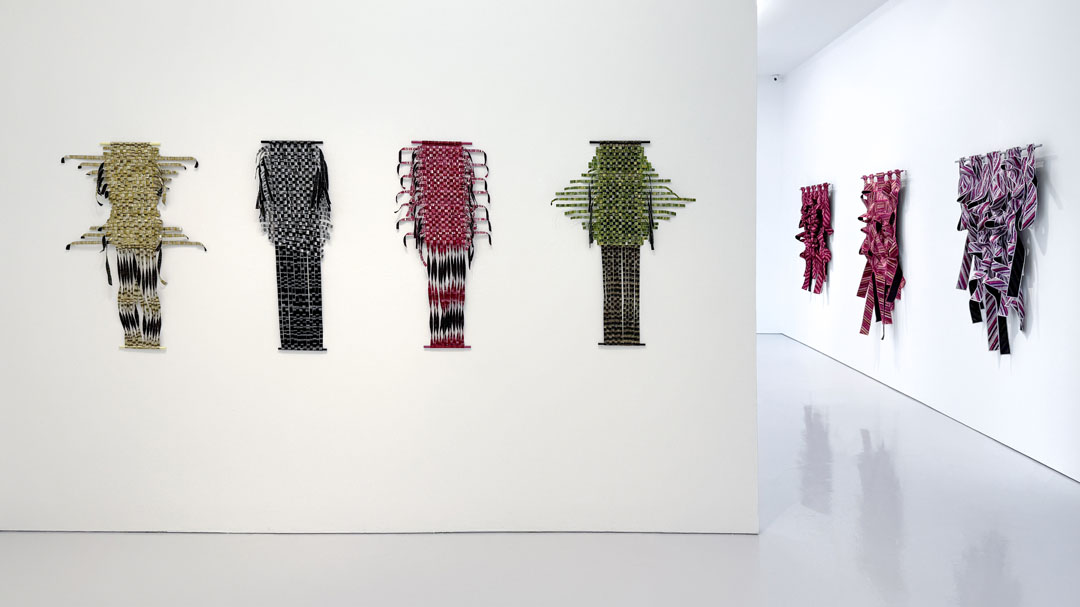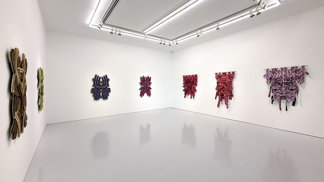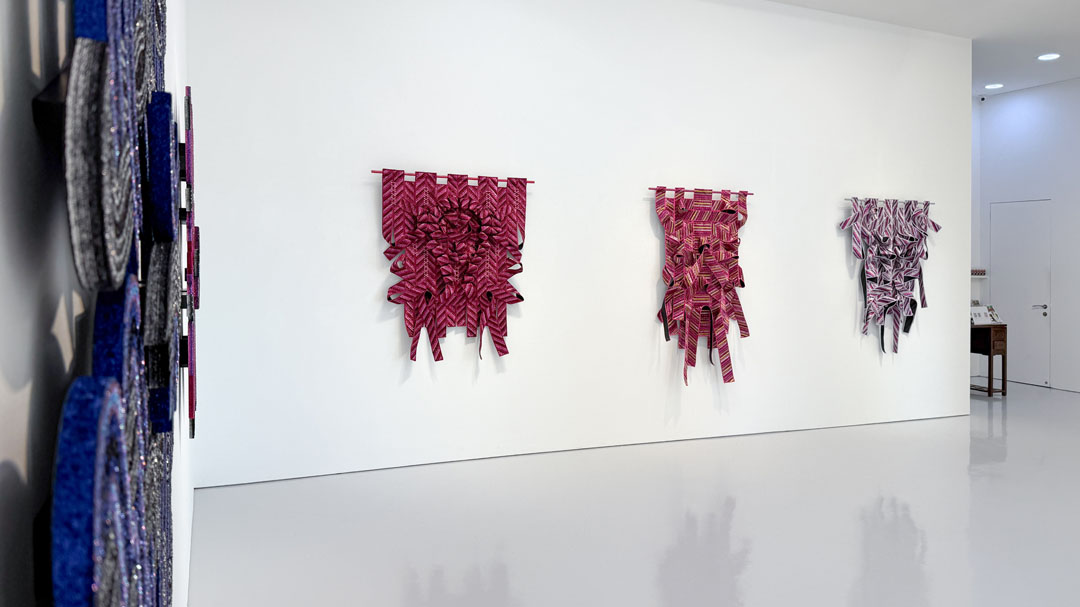 Central to the works are simulated weave reliefs—layered textile constructions that function as a kind of secondary skin. These sculptural elements echo the artist’s ongoing exploration of garments as mediators of the self, simultaneously revealing and protecting. The tension between defence and display is palpable, as embellishment becomes a strategy for preserving personal history while projecting individuality.